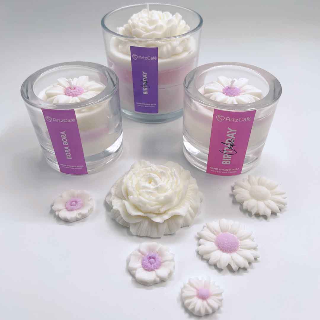 A Peony Candle or Daisy Candle is the perfect gift. Each candle is hand poured and has a burn time of approximately 24 hours. This sweet and festive candle is made with 100% SOYA wax and scented with the highest quality Fragrance Oils, Birthday Cake Fragrance or Bora Bora Fragrance.